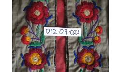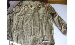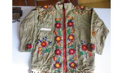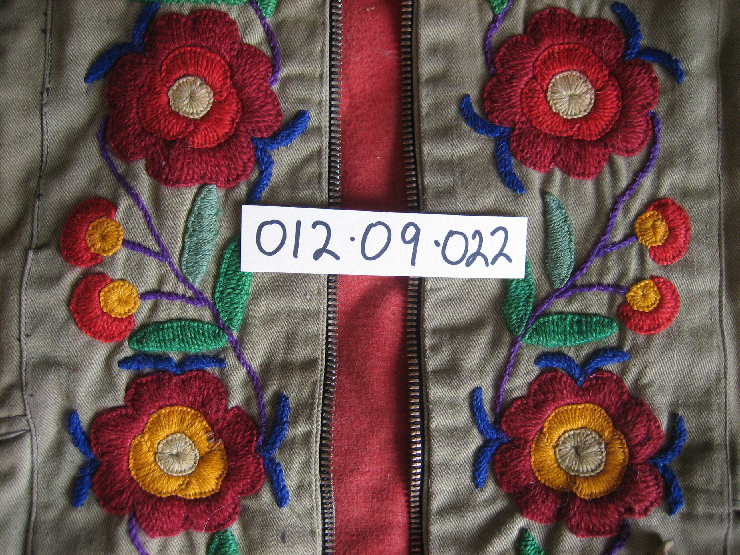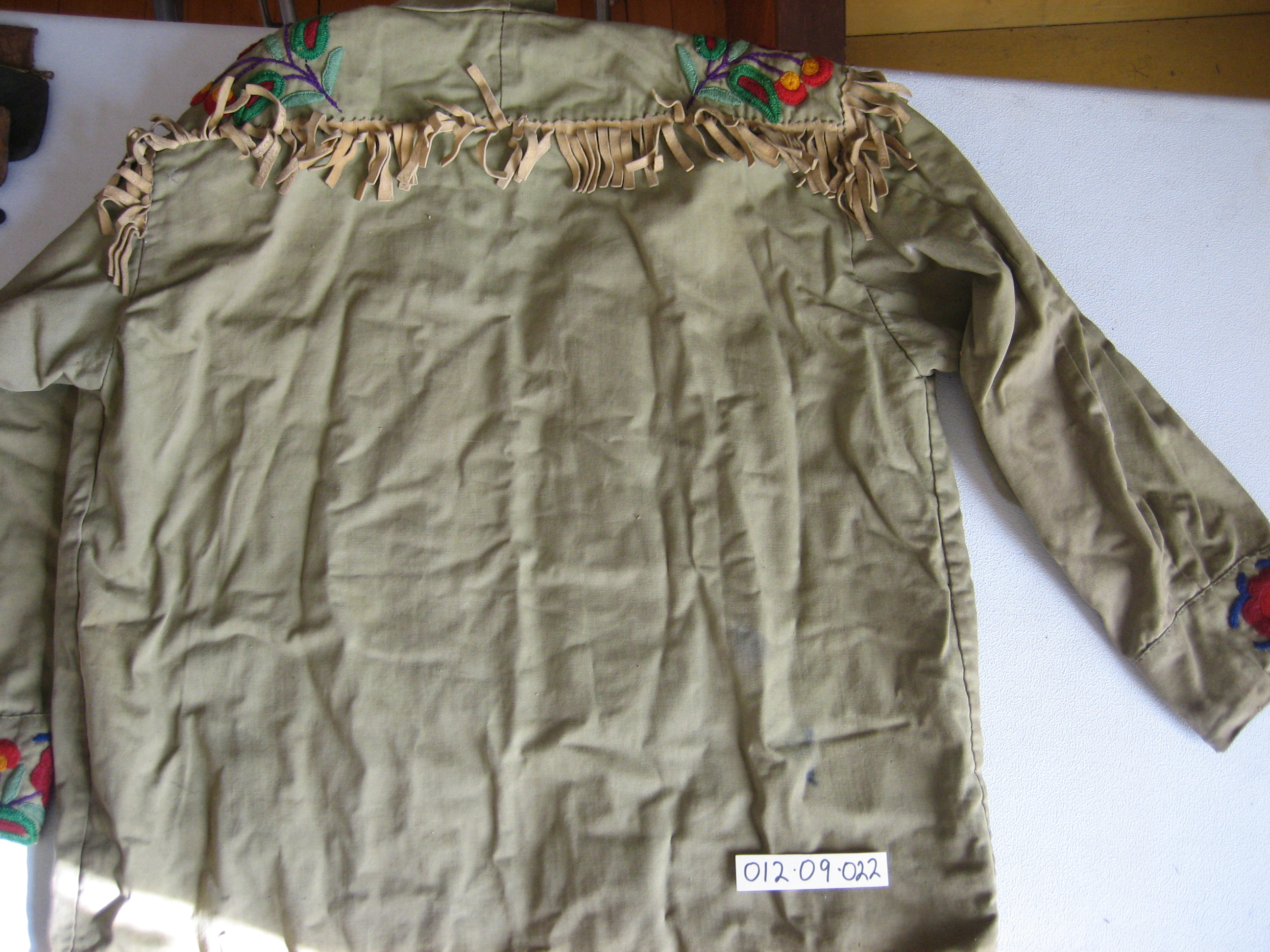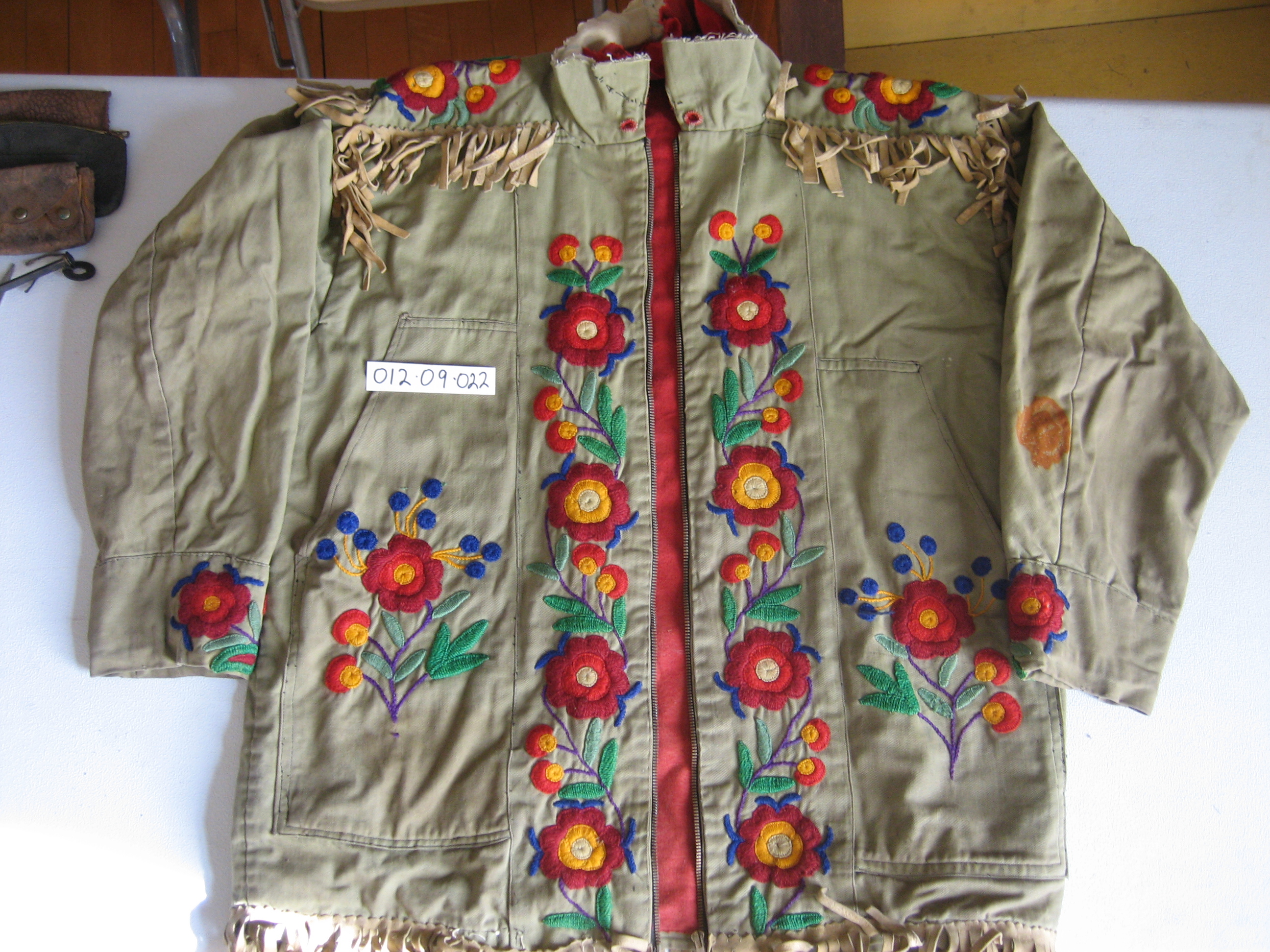 Physical Description Army green coat w. indigenous design embroidery - collar cut off - buck skin fringes, metal zipper, red felt lining